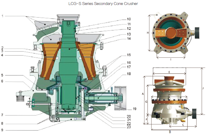 Luckcome has developed the LCG series cone crushers to fulfill all crushing needs. Incorporating the latest crusher know-how, the LCG series combines the highest crushing efficiency and end product quality with the lowest per ton production costs. If your aggregate or mining business demands big capacities, first-class cubicity or full mobility, you will find a Luckcome LCG crusher optimized for your needs. The LCG series cone crushers also provide you with unlimited possibilities in smooth process adaptation and full crushing process automation. Three typical crusher sizes are available for LCG-S series secondary cone crushers, altogether a selection of six different cavity profiles. Another five crusher sizes are available for LCG series cone crushers
